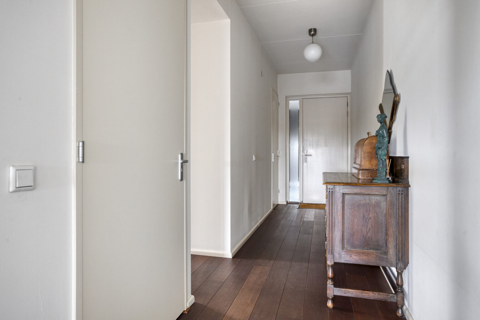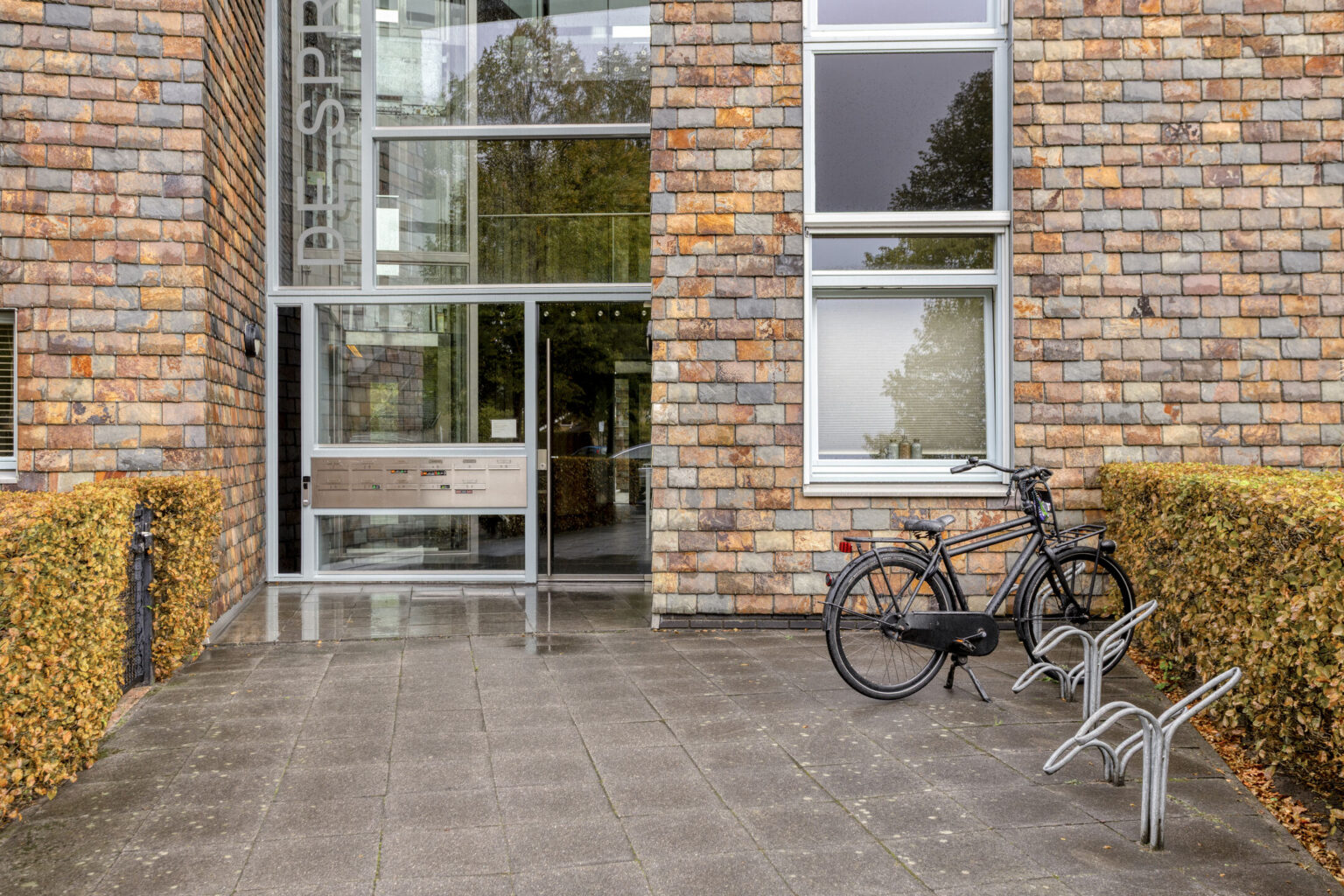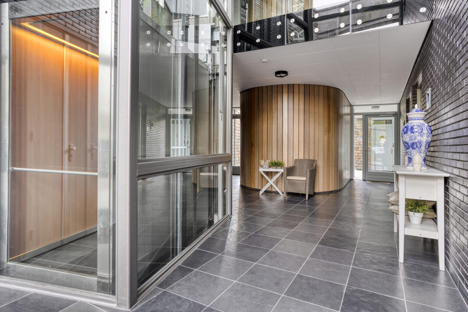 De centrale hal/entree is keurig afgewerkt en biedt het bellentableau, de intercominstallatie, brievenbussen, toegang tot het trappenhuis en tot de lift. Tevens bereik je vanuit de hal de goed onderhouden centrale tuin.