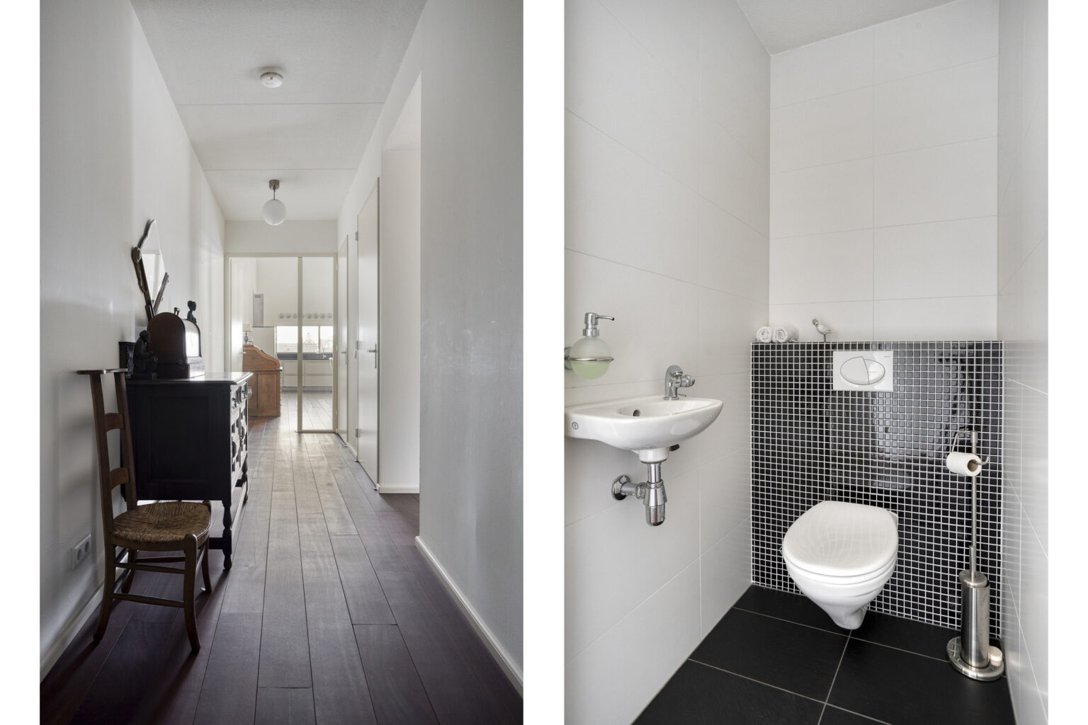 Het separate toilet is netjes uitgevoerd en voorzien van een hangcloset en een fontein. Een frisse, moderne ruimte die perfect aansluit bij de rest van de afwerking van het appartement.