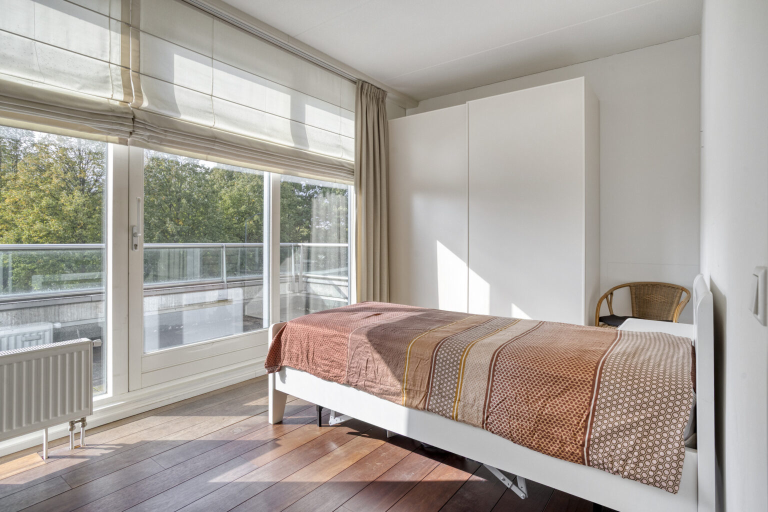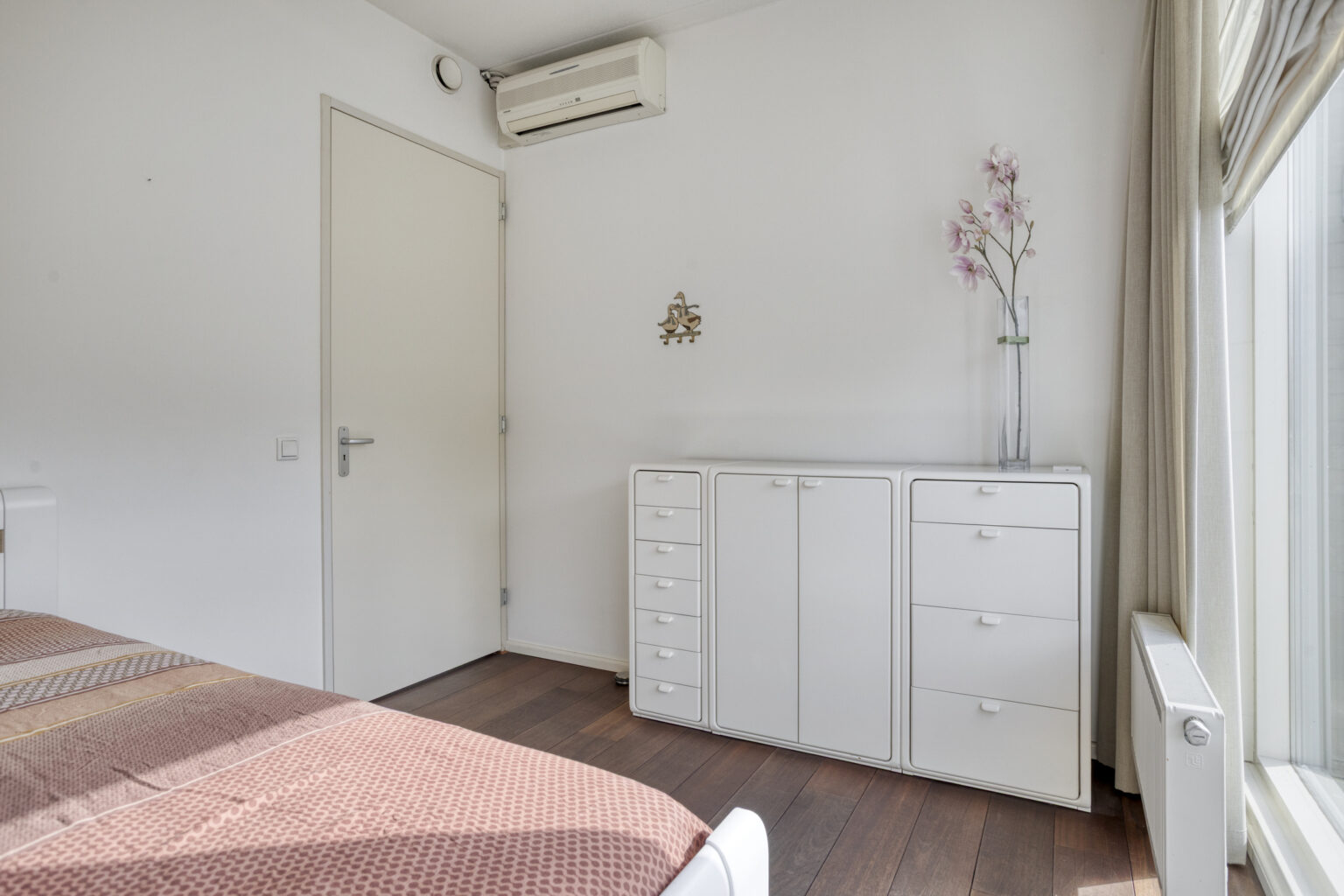 De tweede slaapkamer is eveneens voorzien van een mooie houten vloer, airco en heeft toegang tot het terras.