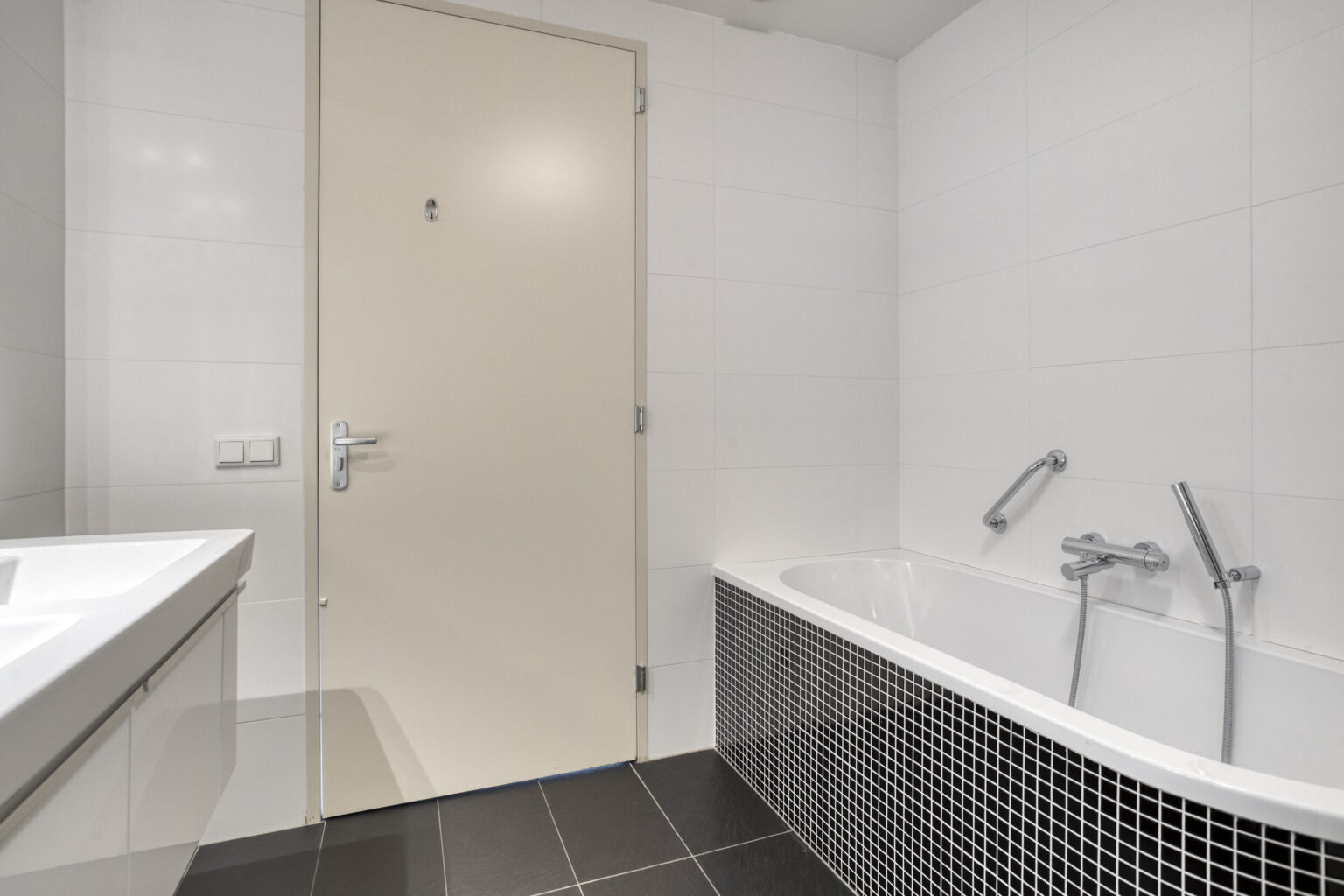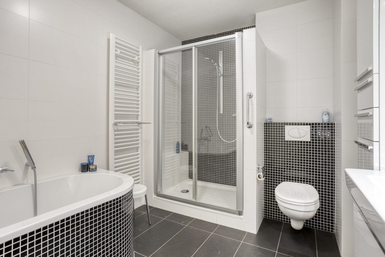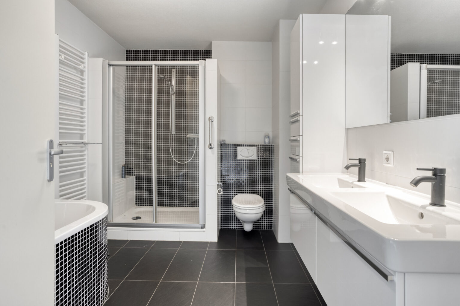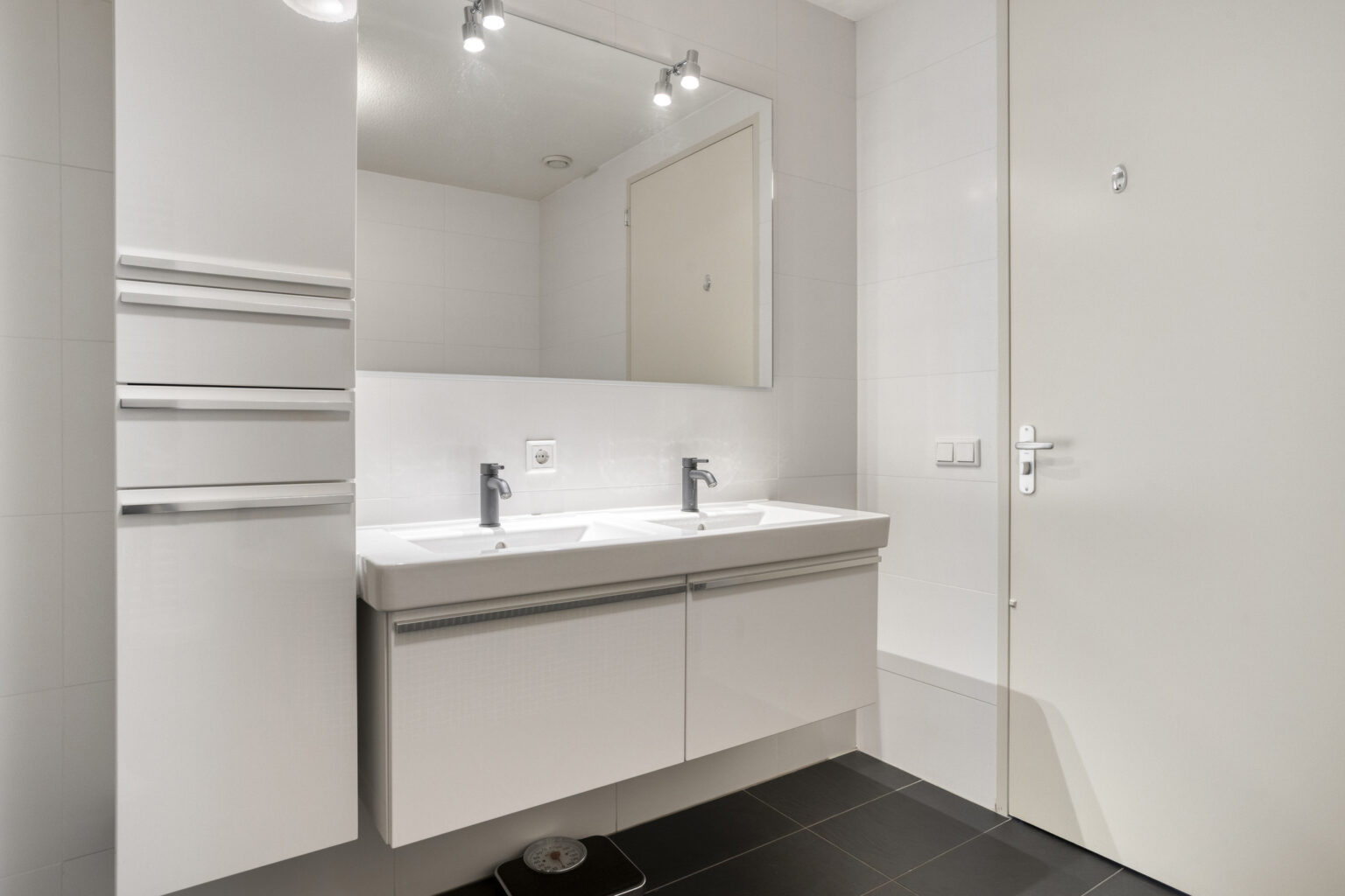 De ruimte is modern ingericht in frisse kleuren en biedt volop comfort. Je vindt hier een ruime douche, een stijlvol hangcloset, een comfortabel ligbad en een dubbel wastafelmeubel met veel bergruimte. Dankzij de praktische indeling en de strakke afwerking is dit een badkamer die luxe en gemak perfect combineert.