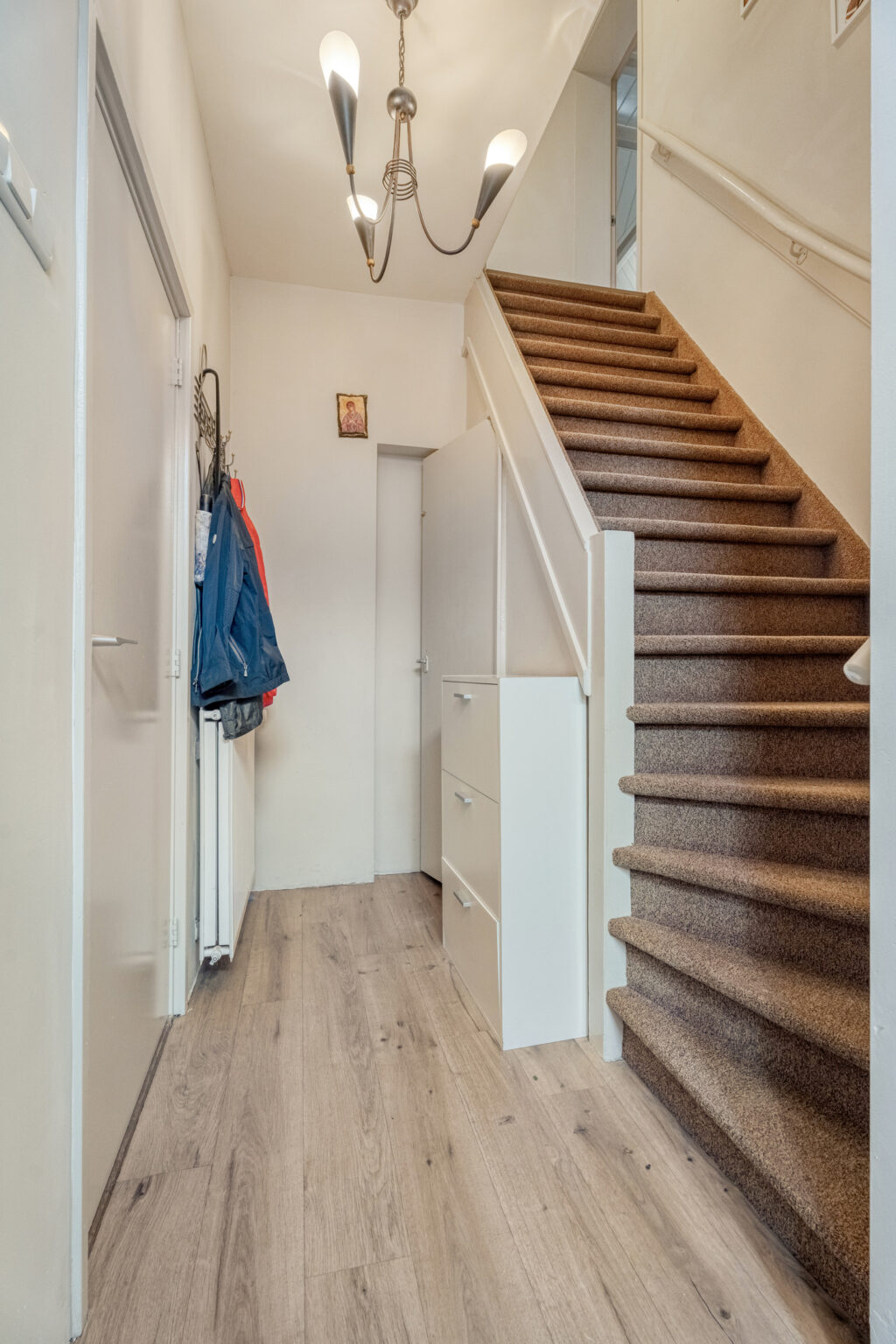 Je stapt binnen in de hal met toegang tot het toilet, de trap, meterkast en woonkamer.