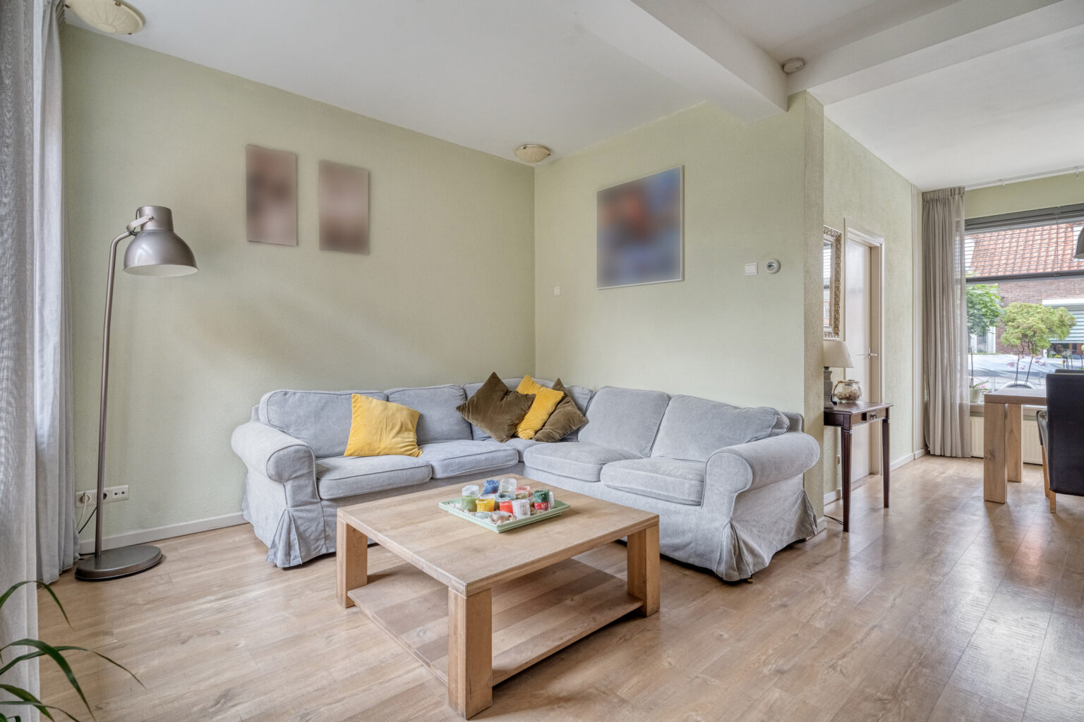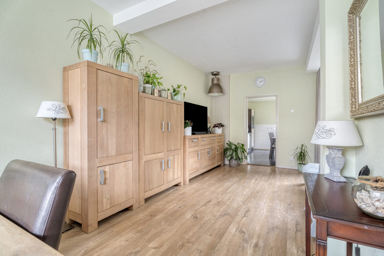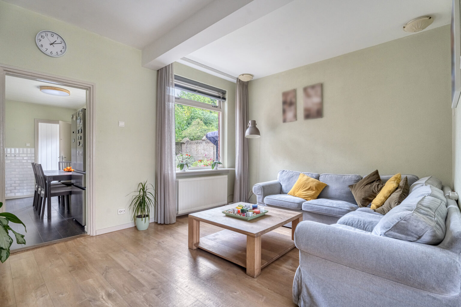 De woonkamer biedt laminaat, stucwanden, stucplafond, grote raampartijen en staat in open verbinding met de keuken.