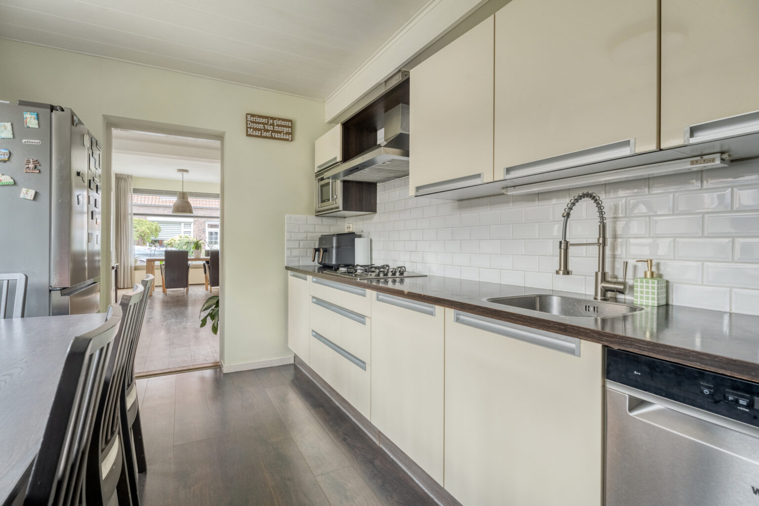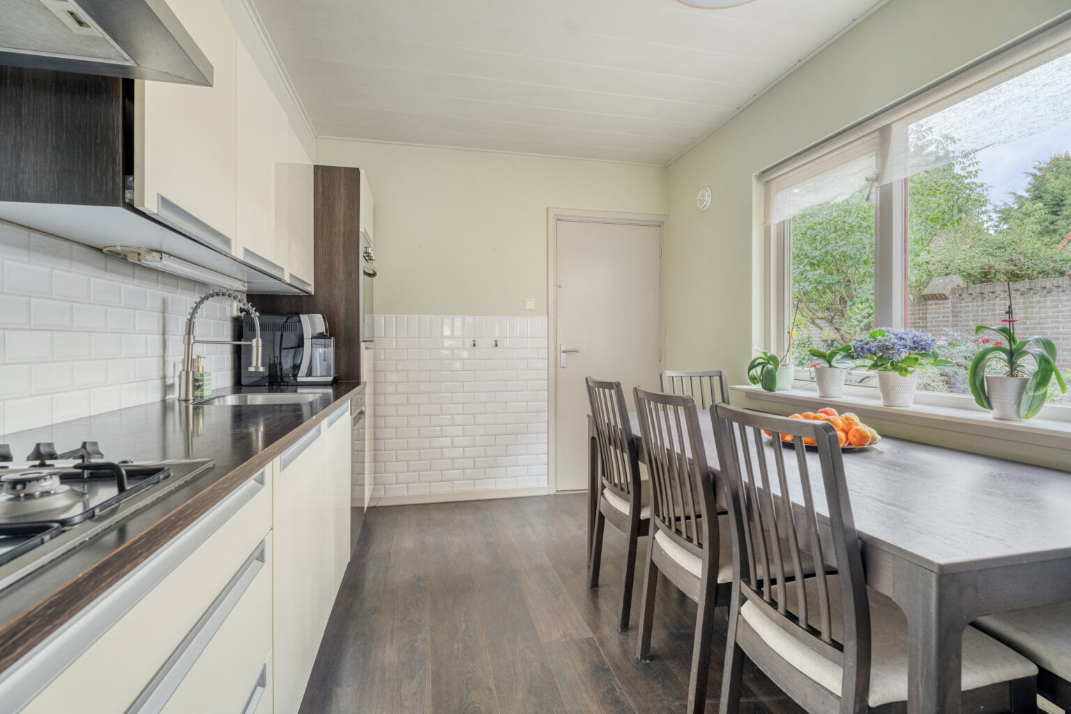 De lichte en ruime keuken in de aanbouw biedt een 4-pits gaskookplaat, afzuigkap, vaatwasser, koelkast, oven, magnetron en volop bergruimte. Vanuit hier bereik je een tussenhal.
