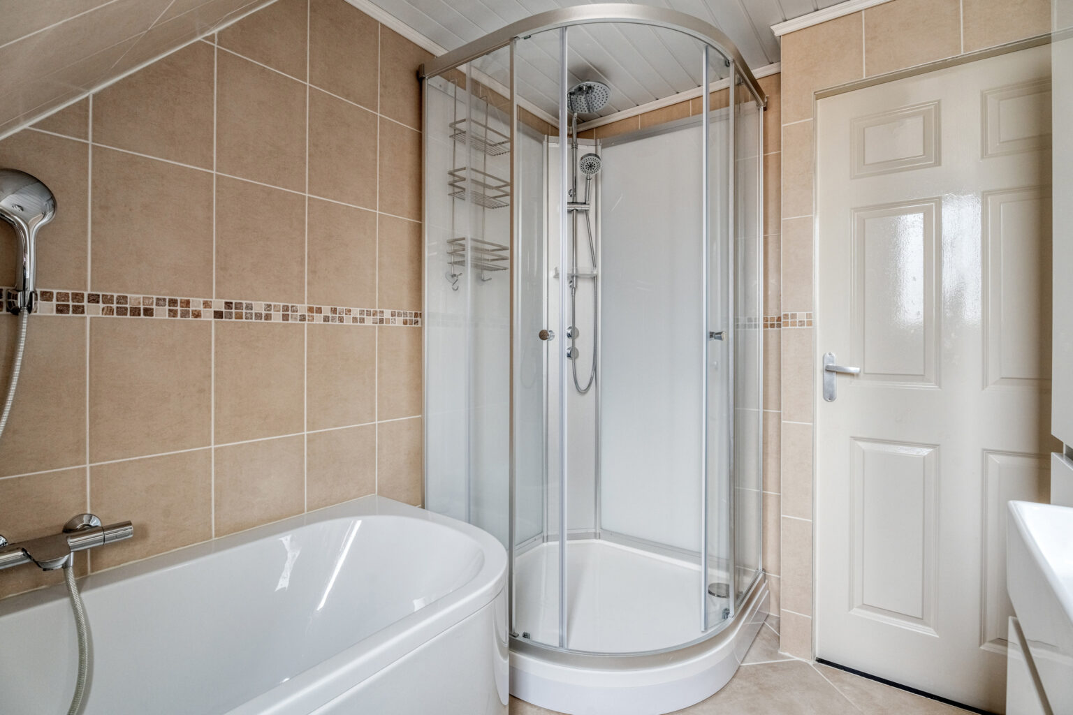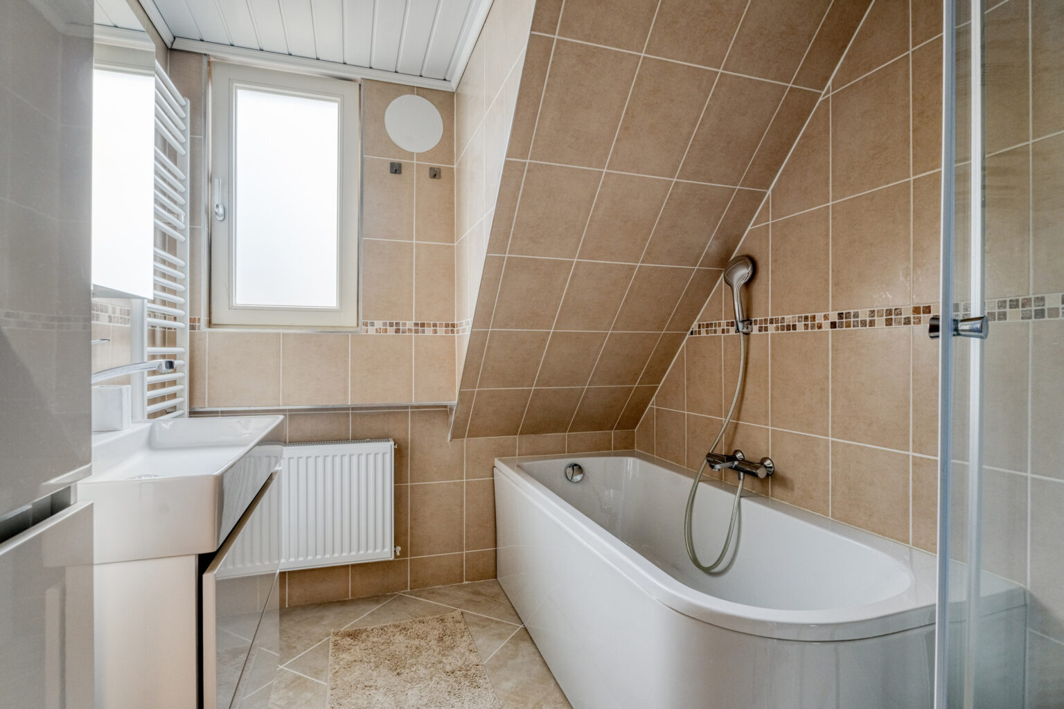 De badkamer is voorzien van een ligbad, aparte douche en een stijlvol meubel, terwijl een aparte toilet- en wasruimte extra gemak biedt.