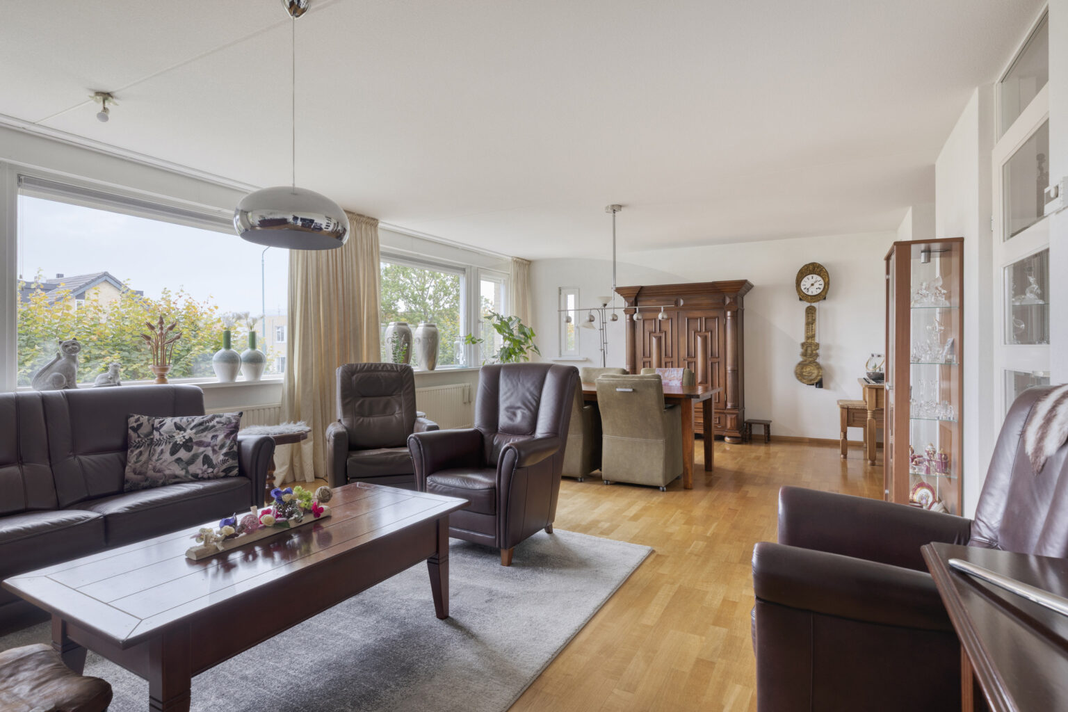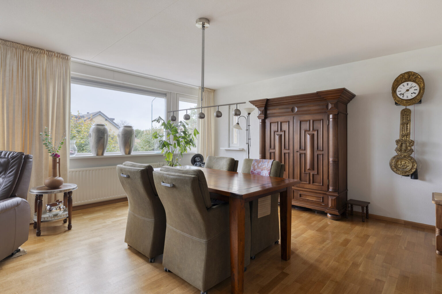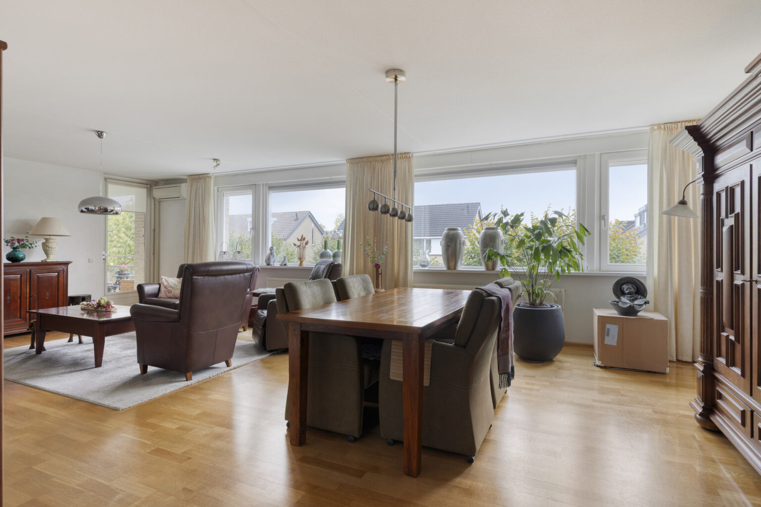 Een heerlijke plek om gasten te ontvangen, met voldoende ruimte voor een comfortabele zit- en eethoek. De parketvloer geeft het geheel een warme en sfeervolle uitstraling.
