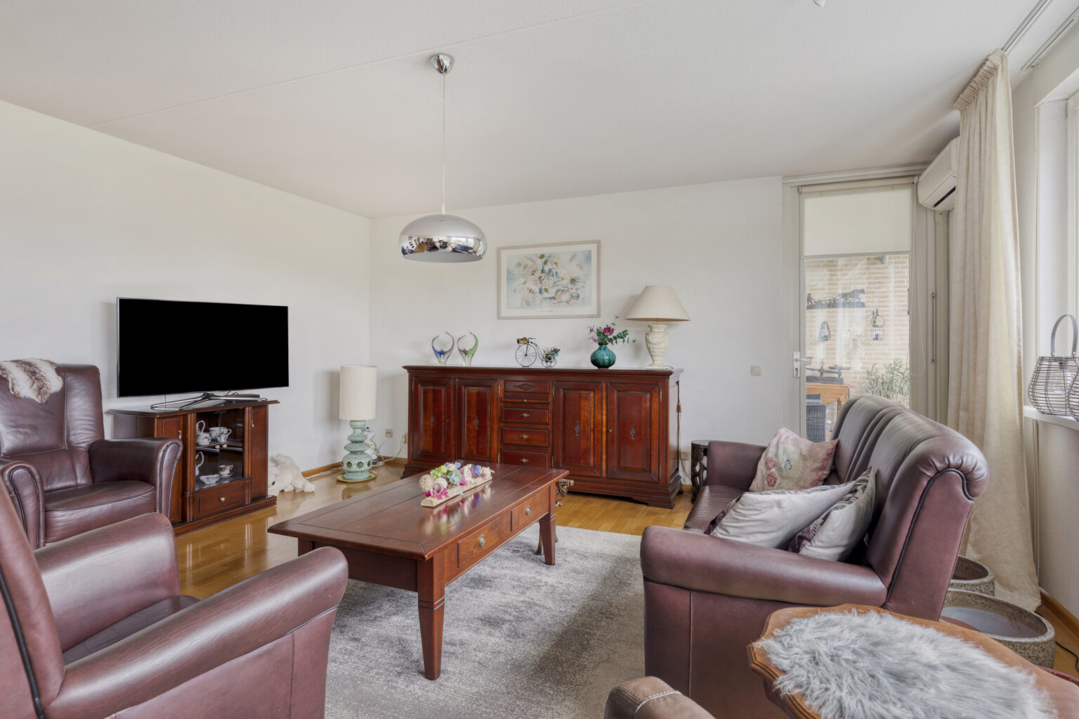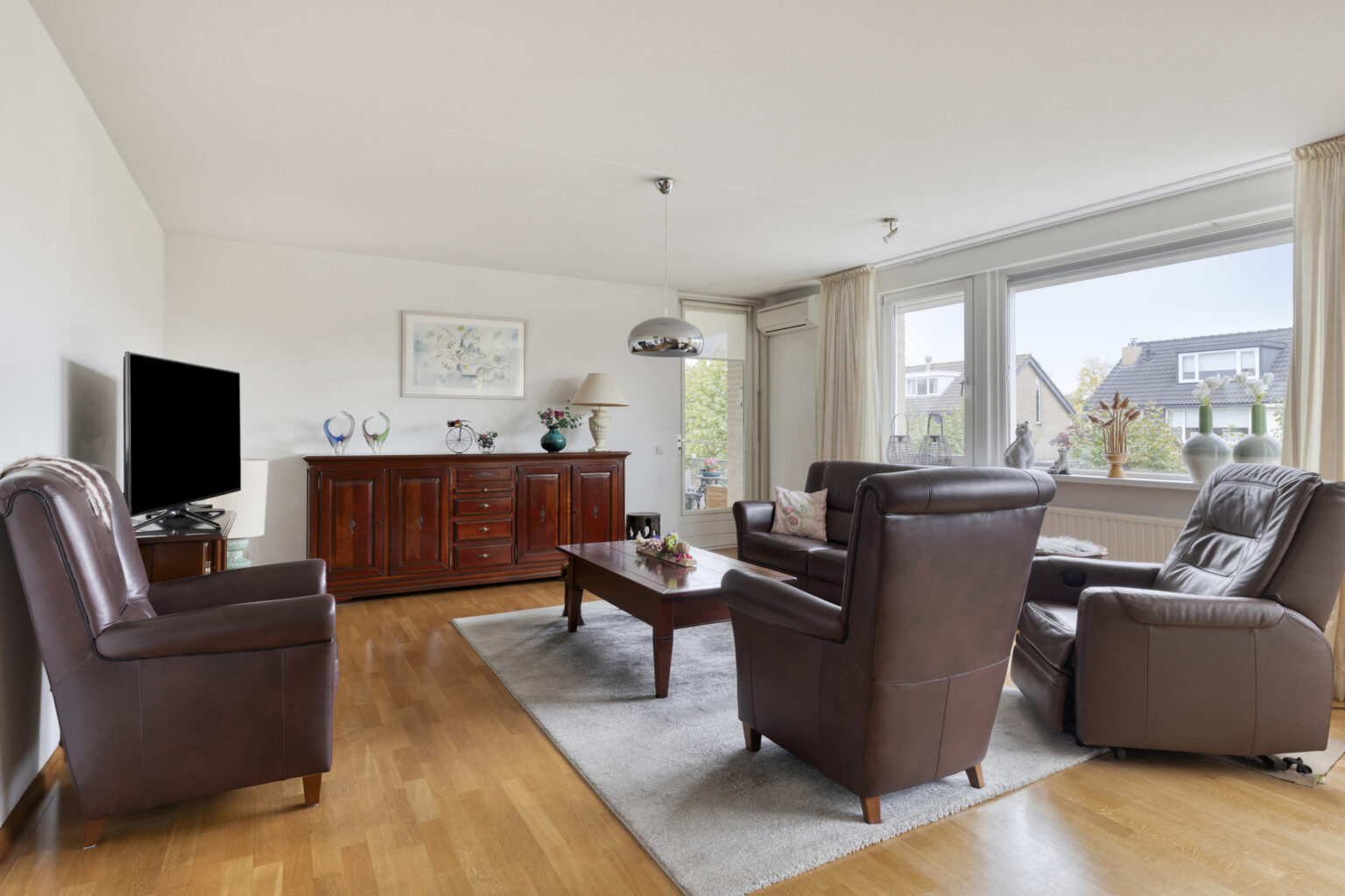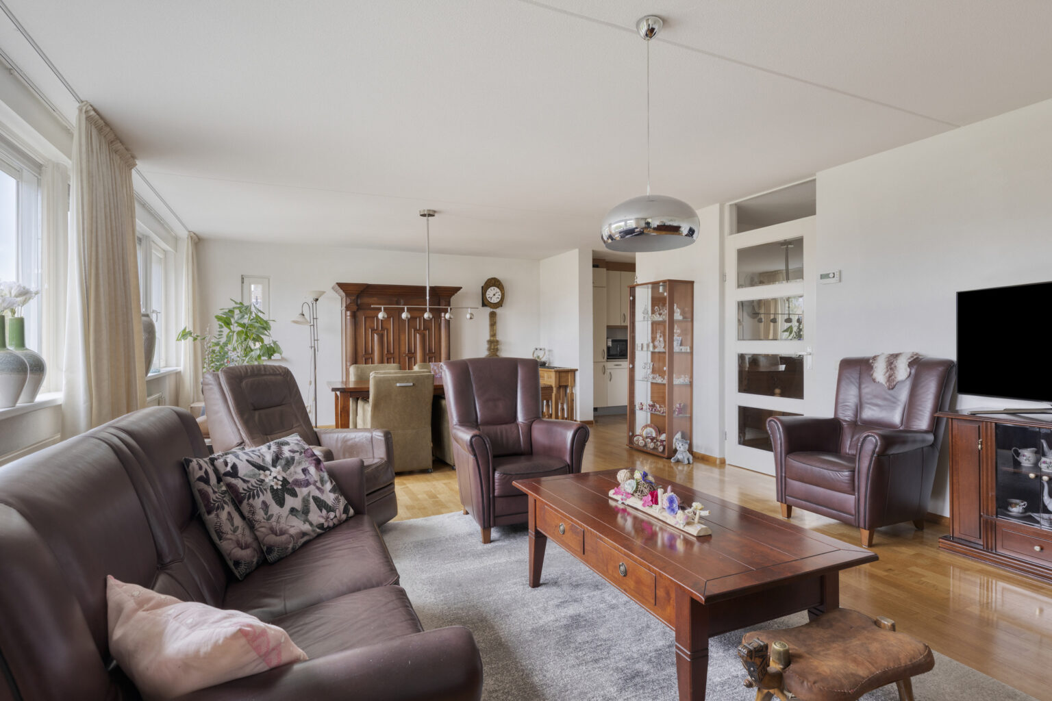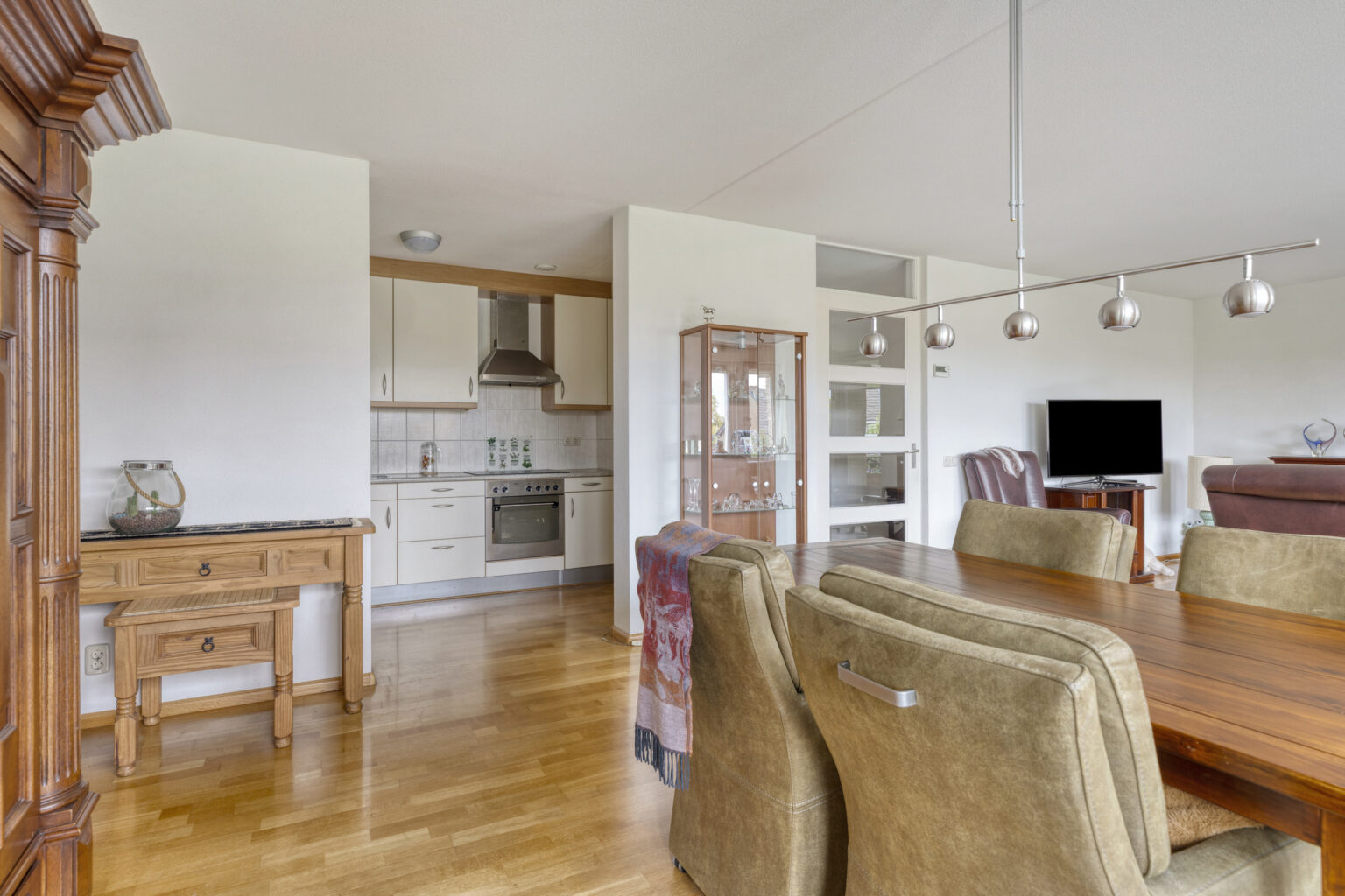 Een heerlijke plek om gasten te ontvangen, met voldoende ruimte voor een comfortabele zit- en eethoek. De parketvloer geeft het geheel een warme en sfeervolle uitstraling.