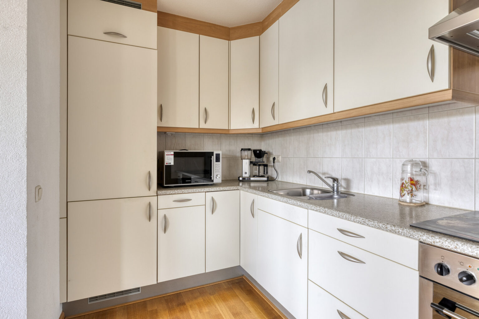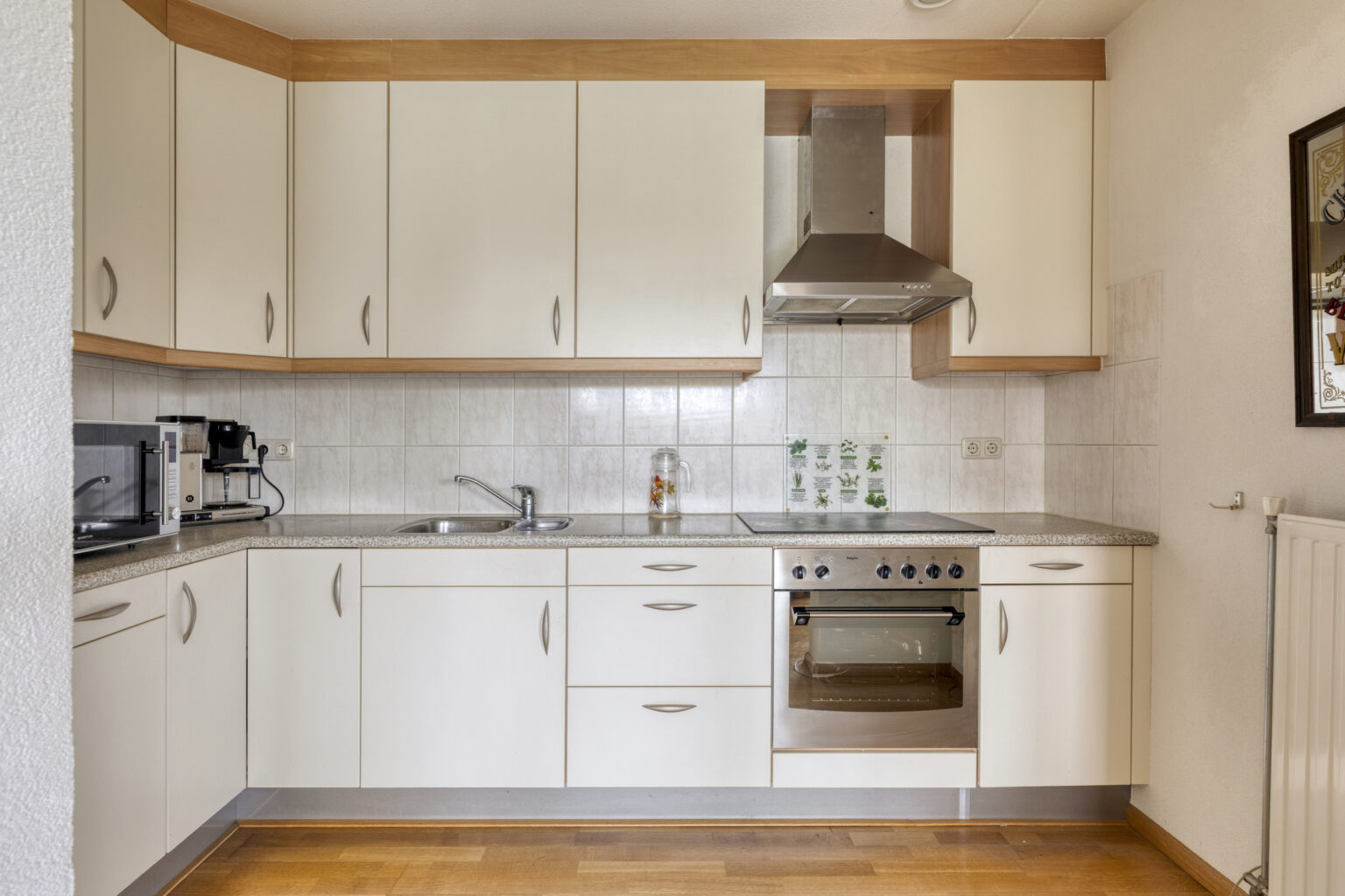 De open keuken sluit hier naadloos op aan en is voorzien van veel werkruimte en diverse inbouwapparatuur, waaronder een 4-pits inductie kookplaat, afzuigkap, oven, koel/vrieskast en voldoende bergruimte.