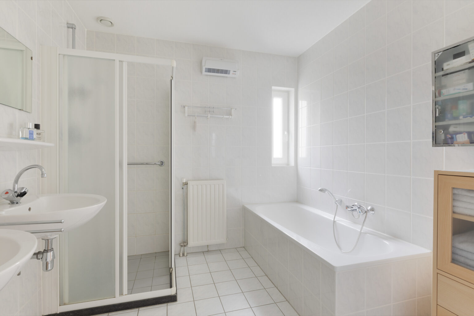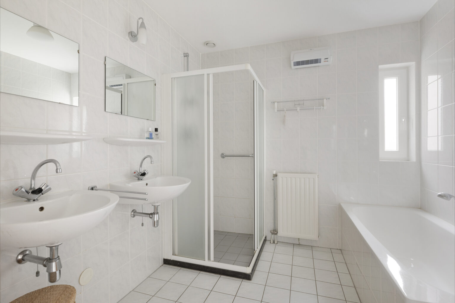 De ruime badkamer is geheel betegeld en uitgerust met een ligbad, douche en twee wastafels – comfortabel en praktisch ingedeeld.
