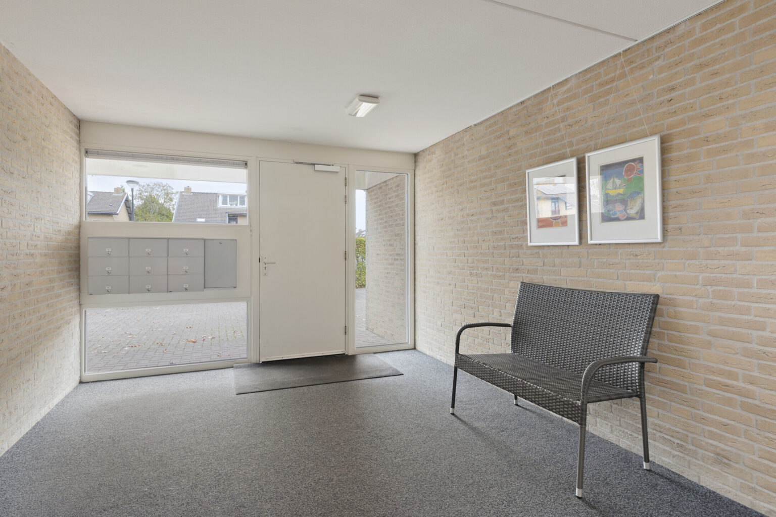 Vervolgens bereik je de entree met intercominstallatie, bellentableau, brievenbussen en toegang tot het trappenhuis, de lift en de bergingen.